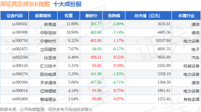 深证民企成长R(470071)指数十大成份股详情如下: