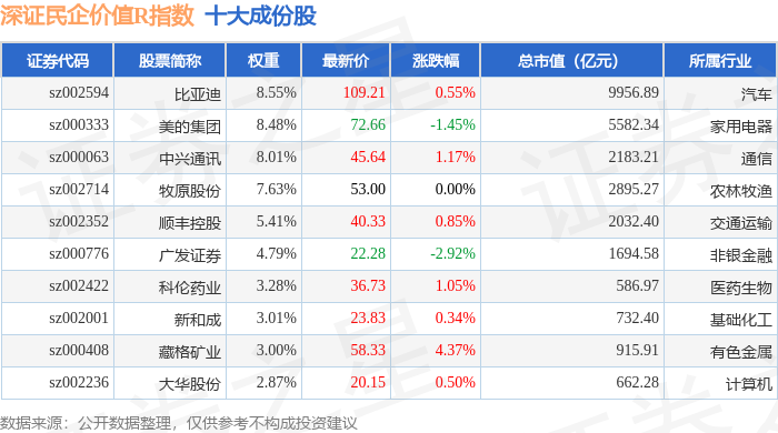 深证民企价值R(470072)指数十大成份股详情如下:
