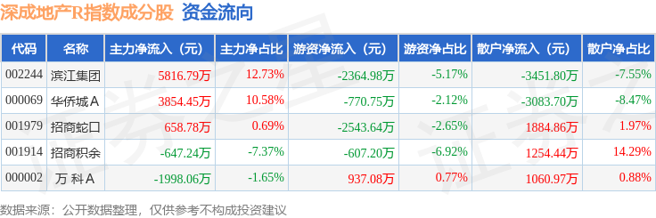资金流向方面,深成地产R(471001)指数成份股当日主力资金净流入合计7684.72万元,游资资金净流出合计5349.49万元,散户资金净流出合计2335.23万元。成份股资金流向详情见下表: