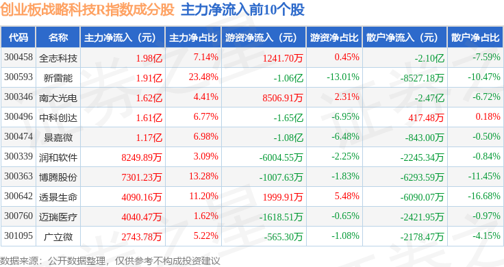 资金流向方面,创业板战略科技R(471004)指数成份股当日主力资金净流出合计49.05万元,游资资金净流出合计1.18亿元,散户资金净流入合计1.19亿元。成份股资金流向详情见下表: