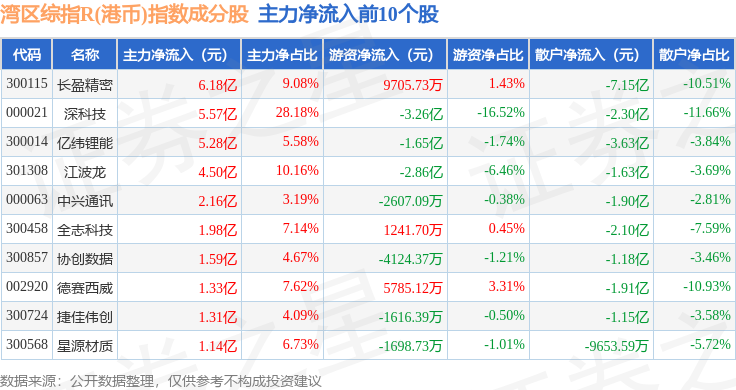资金流向方面,湾区综指R(港币)(480004)指数成份股当日主力资金净流出合计118.9亿元,游资资金净流入合计45.1亿元,散户资金净流入合计73.8亿元。成份股资金流向详情见下表: