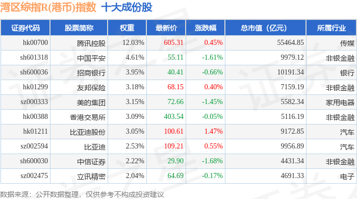 湾区综指R(港币)(480004)指数十大成份股详情如下: