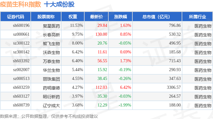疫苗生科R(480015)指数十大成份股详情如下: