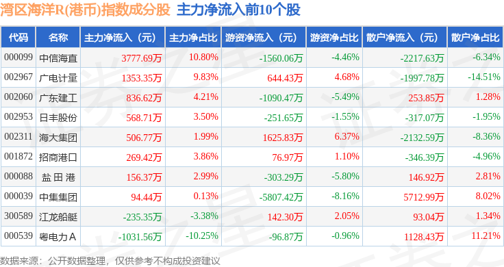 资金流向方面,湾区海洋R(港币)(480020)指数成份股当日主力资金净流入合计317.64万元,游资资金净流出合计4342.84万元,散户资金净流入合计4025.2万元。成份股资金流向详情见下表: