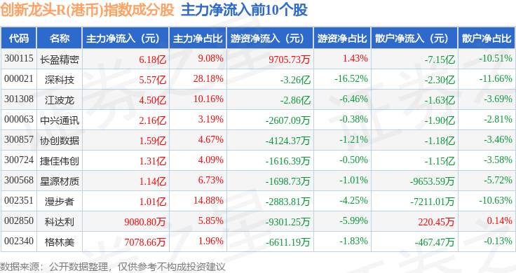 资金流向方面,创新龙头R(港币)(480037)指数成份股当日主力资金净流出合计29.04亿元,游资资金净流入合计7.51亿元,散户资金净流入合计21.53亿元。成份股资金流向详情见下表: