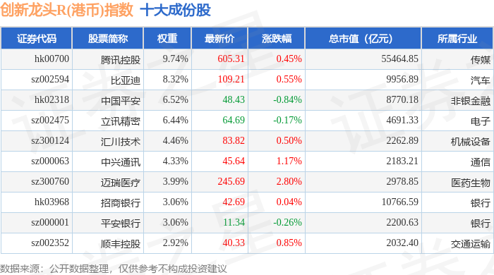 创新龙头R(港币)(480037)指数十大成份股详情如下: