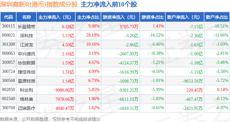 资金流向方面,深圳高新R(港币)(480039)指数成份股当日主力资金净流出合计9.39亿元,游资资金净流入合计4.22亿元,散户资金净流入合计5.17亿元。成份股资金流向详情见下表: