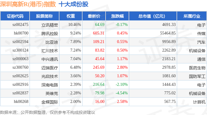 深圳高新R(港币)(480039)指数十大成份股详情如下: