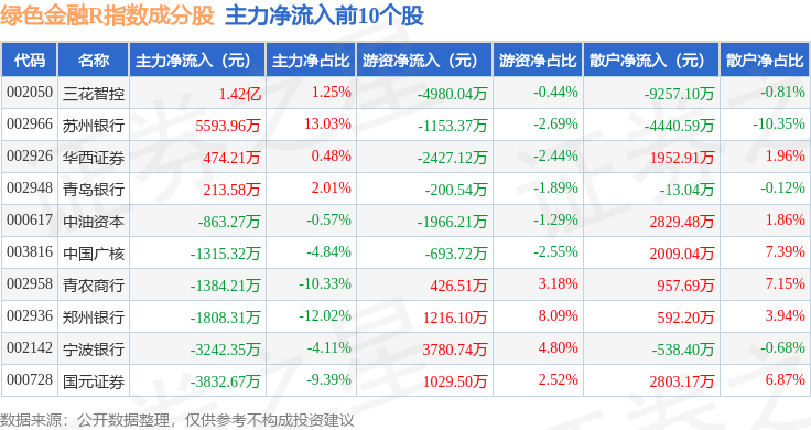 资金流向方面,绿色金融R(480052)指数成份股当日主力资金净流出合计31.67亿元,游资资金净流入合计10.4亿元,散户资金净流入合计21.28亿元。成份股资金流向详情见下表: