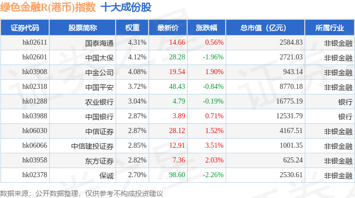 绿色金融R(港币)(480053)指数十大成份股详情如下: