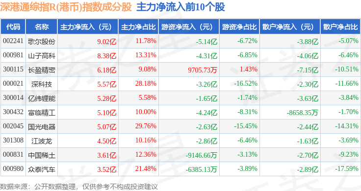 资金流向方面,深港通综指R(港币)(483006)指数成份股当日主力资金净流出合计251.0亿元,游资资金净流入合计52.19亿元,散户资金净流入合计198.81亿元。成份股资金流向详情见下表: