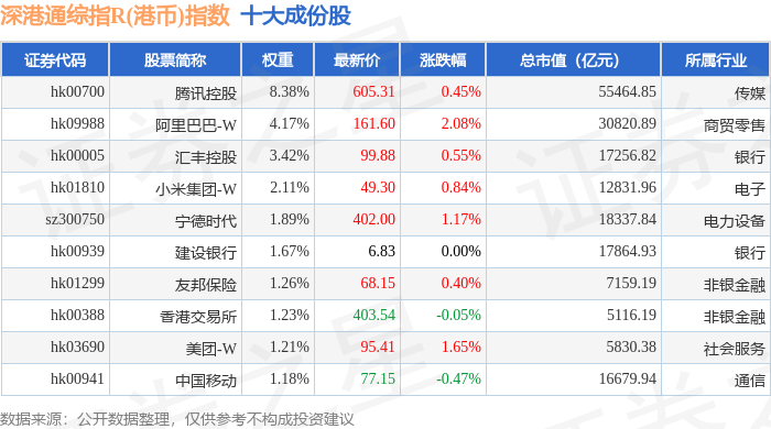 深港通综指R(港币)(483006)指数十大成份股详情如下: