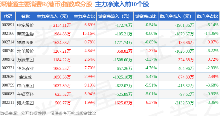 资金流向方面,深港通主要消费R(港币)(483022)指数成份股当日主力资金净流出合计9.92亿元,游资资金净流入合计2.31亿元,散户资金净流入合计7.61亿元。成份股资金流向详情见下表: