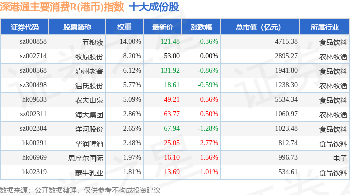 深港通主要消费R(港币)(483022)指数十大成份股详情如下: