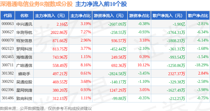 资金流向方面,深港通电信业务R(483029)指数成份股当日主力资金净流出合计58.8亿元,游资资金净流入合计21.97亿元,散户资金净流入合计36.83亿元。成份股资金流向详情见下表: