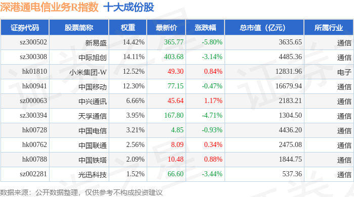 深港通电信业务R(483029)指数十大成份股详情如下:
