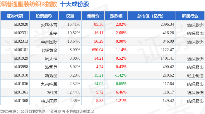 深港通服装纺织R(483041)指数十大成份股详情如下: