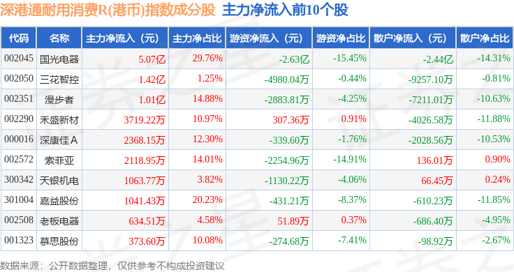资金流向方面,深港通耐用消费R(港币)(483050)指数成份股当日主力资金净流出合计2.37亿元,游资资金净流入合计2953.02万元,散户资金净流入合计2.08亿元。成份股资金流向详情见下表:
