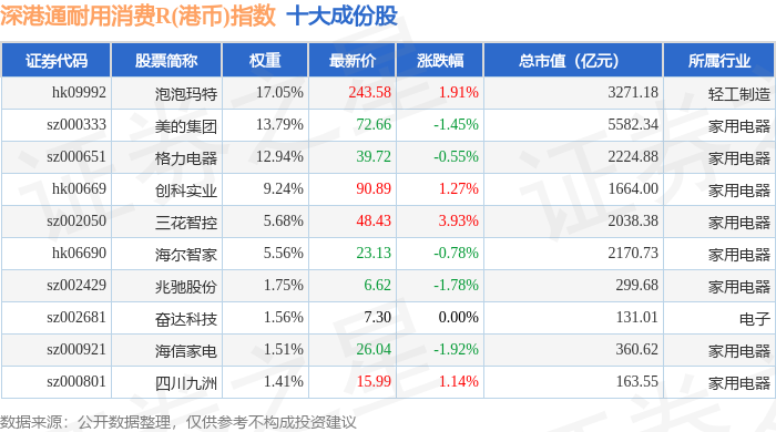 深港通耐用消费R(港币)(483050)指数十大成份股详情如下: