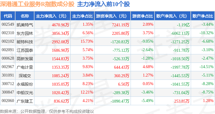 资金流向方面,深港通工业服务R(483055)指数成份股当日主力资金净流出合计10.73亿元,游资资金净流入合计4.58亿元,散户资金净流入合计6.14亿元。成份股资金流向详情见下表: