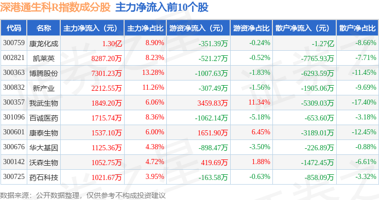 资金流向方面,深港通生科R(483059)指数成份股当日主力资金净流入合计1.67亿元,游资资金净流入合计9064.26万元,散户资金净流出合计2.58亿元。成份股资金流向详情见下表: