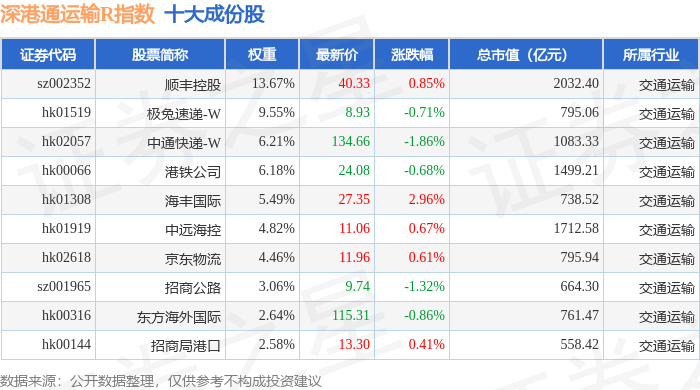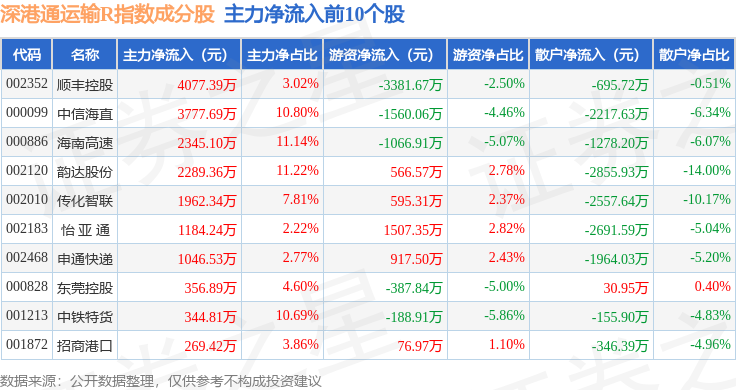 资金流向方面,深港通运输R(483077)指数成份股当日主力资金净流入合计1.03亿元,游资资金净流出合计1847.48万元,散户资金净流出合计8499.28万元。成份股资金流向详情见下表: