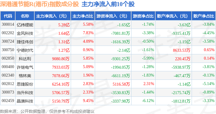 资金流向方面,深港通节能R(港币)(483086)指数成份股当日主力资金净流出合计31.88亿元,游资资金净流入合计10.01亿元,散户资金净流入合计21.87亿元。成份股资金流向详情见下表: