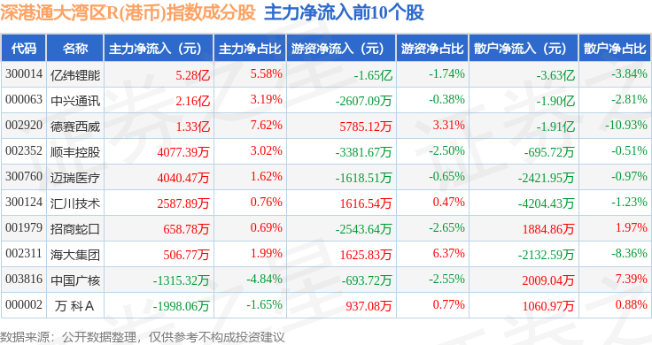 资金流向方面,深港通大湾区R(港币)(483090)指数成份股当日主力资金净流出合计28.46亿元,游资资金净流入合计17.48亿元,散户资金净流入合计10.97亿元。成份股资金流向详情见下表: