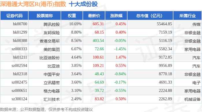 深港通大湾区R(港币)(483090)指数十大成份股详情如下: