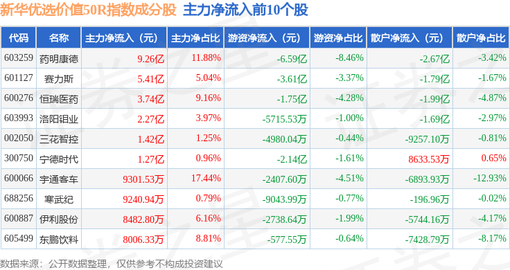 资金流向方面,新华优选价值50R(489004)指数成份股当日主力资金净流出合计115.92亿元,游资资金净流入合计54.96亿元,散户资金净流入合计60.96亿元。成份股资金流向详情见下表: