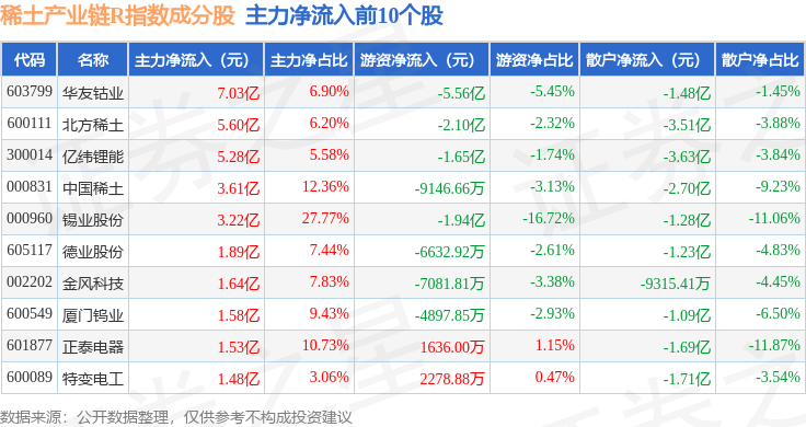 资金流向方面,稀土产业链R(489013)指数成份股当日主力资金净流入合计18.87亿元,游资资金净流出合计9.34亿元,散户资金净流出合计9.54亿元。成份股资金流向详情见下表: