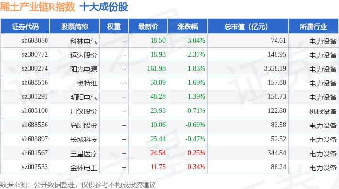 证券之星消息,9月30日,稀土产业链R(489013)指数报收于4103.14点,涨2.41%,成交1184.64亿元,换手率2.91%。当日该指数成份股中,上涨的有42家,固德威以12.68%的涨幅领涨,下跌的有8家,科林电气以3.04%的跌幅领跌。