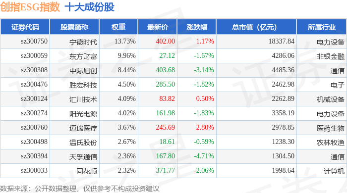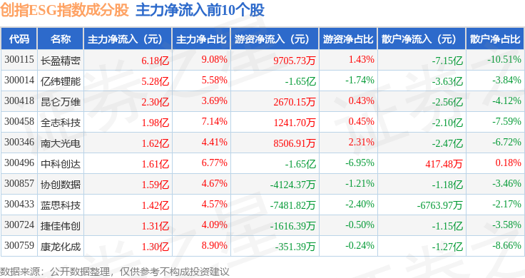 资金流向方面,创指ESG(970028)指数成份股当日主力资金净流出合计56.73亿元,游资资金净流入合计25.96亿元,散户资金净流入合计30.76亿元。成份股资金流向详情见下表: