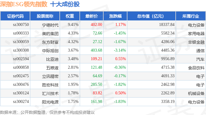 证券之星消息,9月30日,深指ESG领先(970029)指数报收于14499.26点,涨0.26%,成交3613.96亿元,换手率1.97%。当日该指数成份股中,上涨的有100家,深科技以9.98%的涨幅领涨,下跌的有96家,华工科技以6.73%的跌幅领跌。
