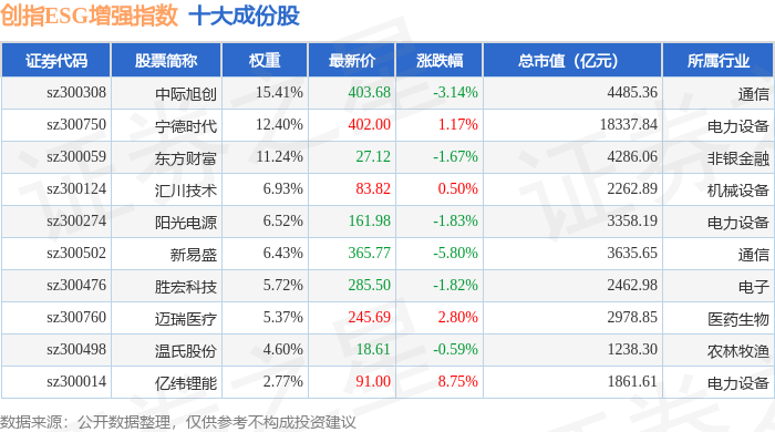 创指ESG增强(970034)指数十大成份股详情如下: