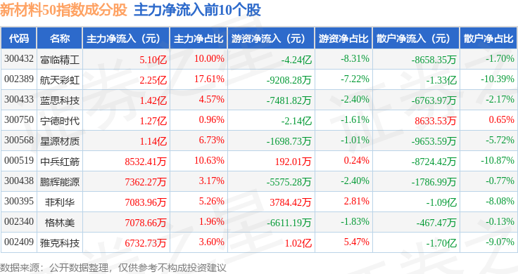资金流向方面,新材料50(970042)指数成份股当日主力资金净流出合计38.49亿元,游资资金净流入合计12.26亿元,散户资金净流入合计26.23亿元。成份股资金流向详情见下表: