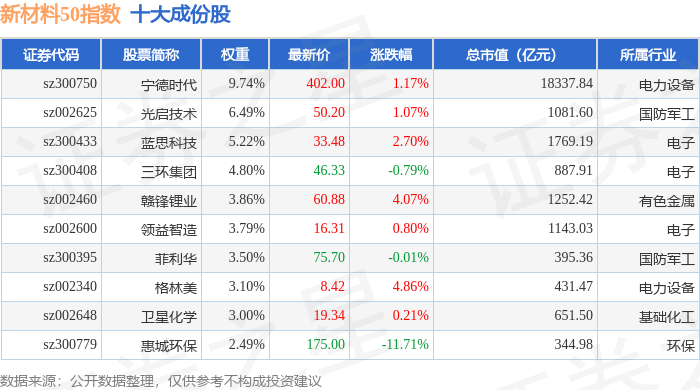 新材料50(970042)指数十大成份股详情如下: