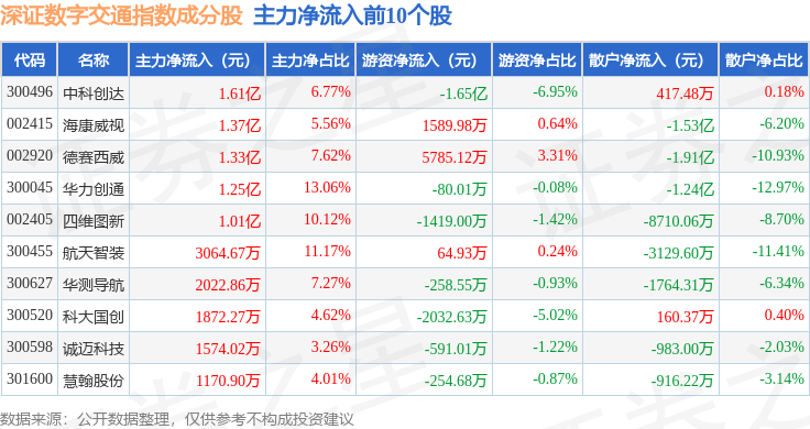 资金流向方面,深证数字交通(970049)指数成份股当日主力资金净流入合计1.26亿元,游资资金净流出合计1.56亿元,散户资金净流入合计2984.0万元。成份股资金流向详情见下表: