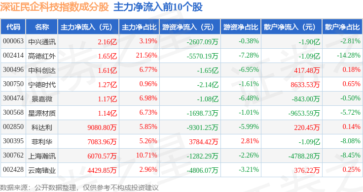 资金流向方面,深证民企科技(970059)指数成份股当日主力资金净流出合计42.23亿元,游资资金净流入合计7.11亿元,散户资金净流入合计35.12亿元。成份股资金流向详情见下表: