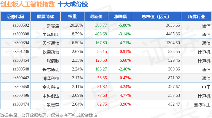 创业板人工智能(970070)指数十大成份股详情如下: