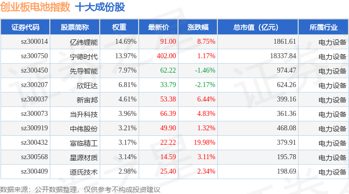 创业板电池(970081)指数十大成份股详情如下: