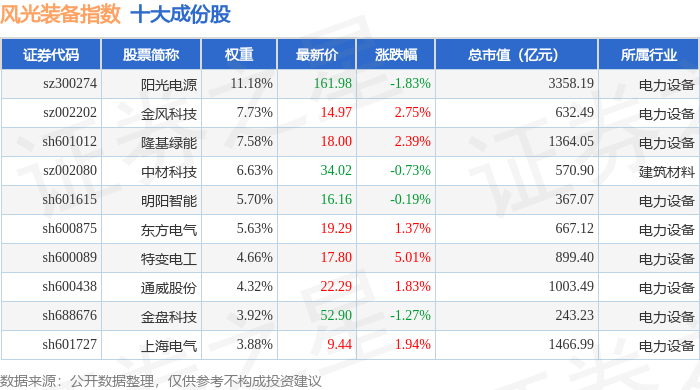 风光装备(980026)指数十大成份股详情如下: