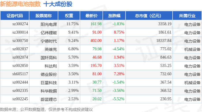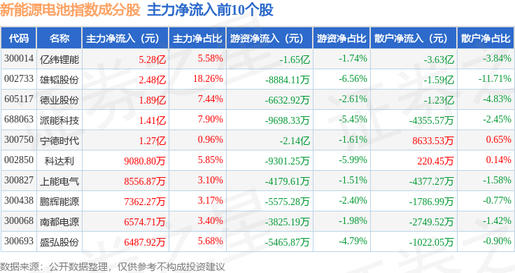 资金流向方面,新能源电池(980027)指数成份股当日主力资金净流出合计17.59亿元,游资资金净流入合计9727.69万元,散户资金净流入合计16.62亿元。成份股资金流向详情见下表: