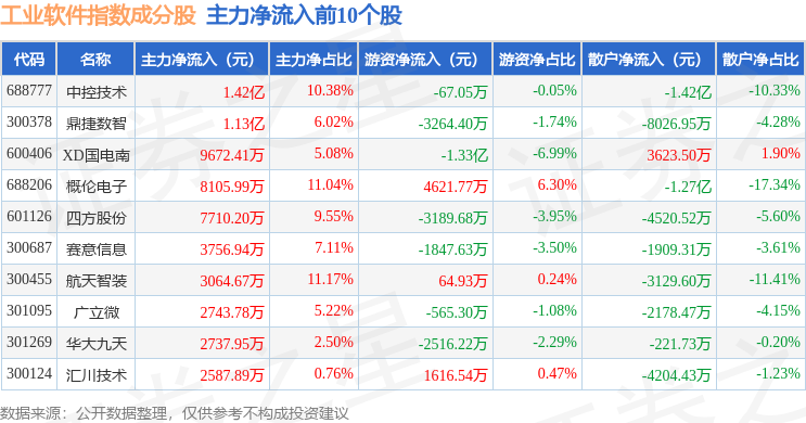 资金流向方面,工业软件(980034)指数成份股当日主力资金净流出合计3.44亿元,游资资金净流出合计6108.68万元,散户资金净流入合计4.05亿元。成份股资金流向详情见下表: