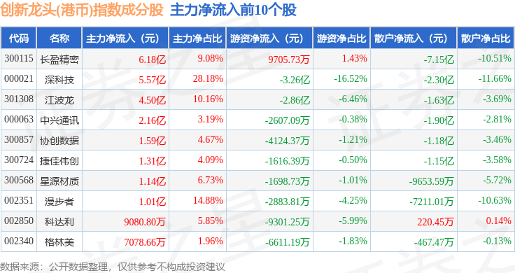 资金流向方面,创新龙头(港币)(980037)指数成份股当日主力资金净流出合计29.04亿元,游资资金净流入合计7.51亿元,散户资金净流入合计21.53亿元。成份股资金流向详情见下表: