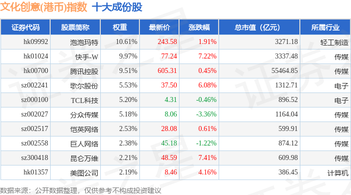 文化创意(港币)(980047)指数十大成份股详情如下: