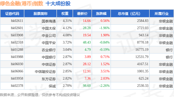 绿色金融(港币)(980053)指数十大成份股详情如下:
