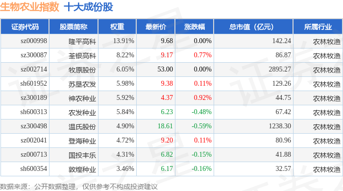 证券之星消息,9月30日,生物农业(980072)指数报收于3249.94点,涨0.4%,成交188.66亿元,换手率1.8%。当日该指数成份股中,上涨的有47家,亨通股份以7.55%的涨幅领涨,下跌的有27家,立华股份以2.91%的跌幅领跌。