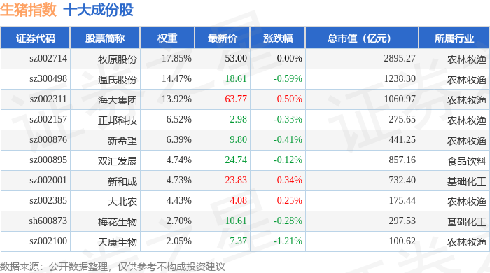 生猪指数(980073)十大成份股详情如下: