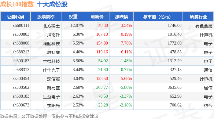 证券之星消息,9月30日,成长100(980080)指数报收于9925.06点,涨1.48%,成交1171.51亿元,换手率3.29%。当日该指数成份股中,上涨的有56家,华懋科技以10.01%的涨幅领涨,下跌的有43家,新易盛以5.8%的跌幅领跌。